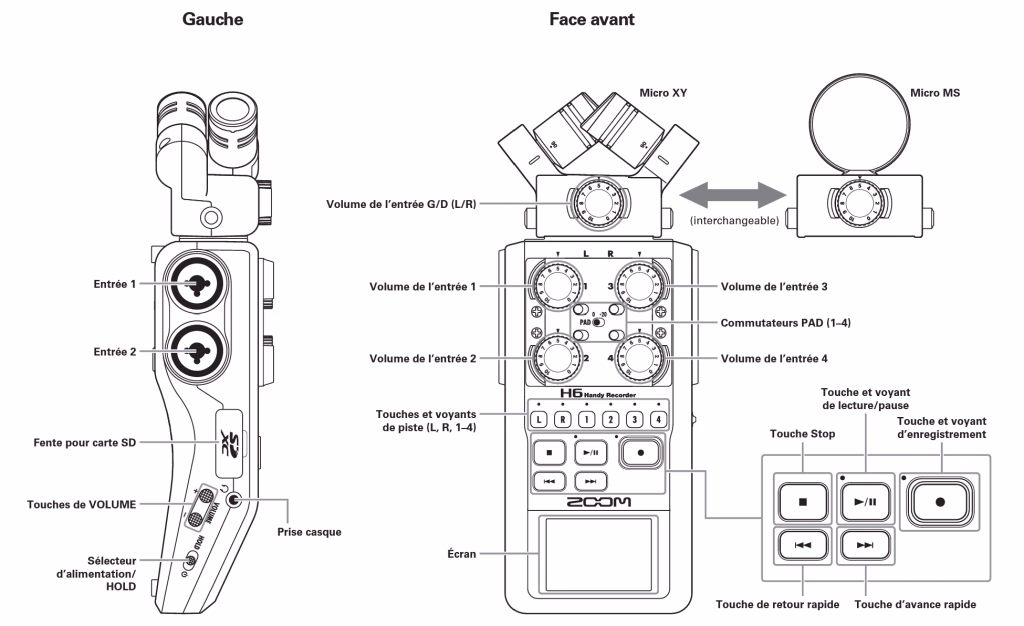 - Micro XY / Stéréo : L’enregistreur peut être utilisé sans câble grâce à son micro XY offrant des captations stéréo sous deux angles possibles via la rotation des micros. Les micros propres au Zoom H6 se branchent toujours sur le haut de l’appareil.